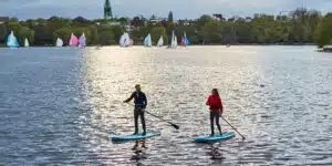 Ist es noch Bochum oder bin ich schon in Essen? Diese Frage hat sich sicher jede(r) Paddler(in) am 21. Mai beim Long Distance SUP-Rennen zum NRW Landesmeisterschaften gestellt. Beim Skipper’s Meeting wurde nämlich erklärt, dass die städtische Grenze zwischen Bochum und Essen mitten im Fluss verlaufen würde. Obwohl sämtliche Genehmigungen von der Stadt Bochum, DLRG-Präsenz und alles Notwendige bereit lagen, meldeten sich die Essener mit Genehmigungs- und Geldforderung, was sich so kurzfristig nicht realisieren lies. Also bot der Veranstalter die Teilnehmer darum, auf der Bochumer Seite des Flusses zu bleiben. Skurrile Zustände, aber die 28 Paddler hat es nicht weiter gestört, etwas näher am Bochumer Seite der Ruhr zu bleiben auf der 2,7 km Strecke (3x zu fahren).