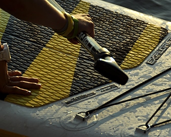 Spitze oder äußerst harte Gegenstände sind schon etwas gefährlicher für die luftgefüllten Boards. Vor allem die Seitenwände sind empfindlicher, da sie oft dünner konzipiert sind, damit ein leichtes Einrollen gewährleistet ist. Doch selbst, wenn das Board ein Loch aufweist – reparieren kann es wirklich jeder! Mit jedem SUP wird auch ein Repair-Kit geliefert. Darin ist alles vorhanden was man für das Flicken des Lecks braucht.